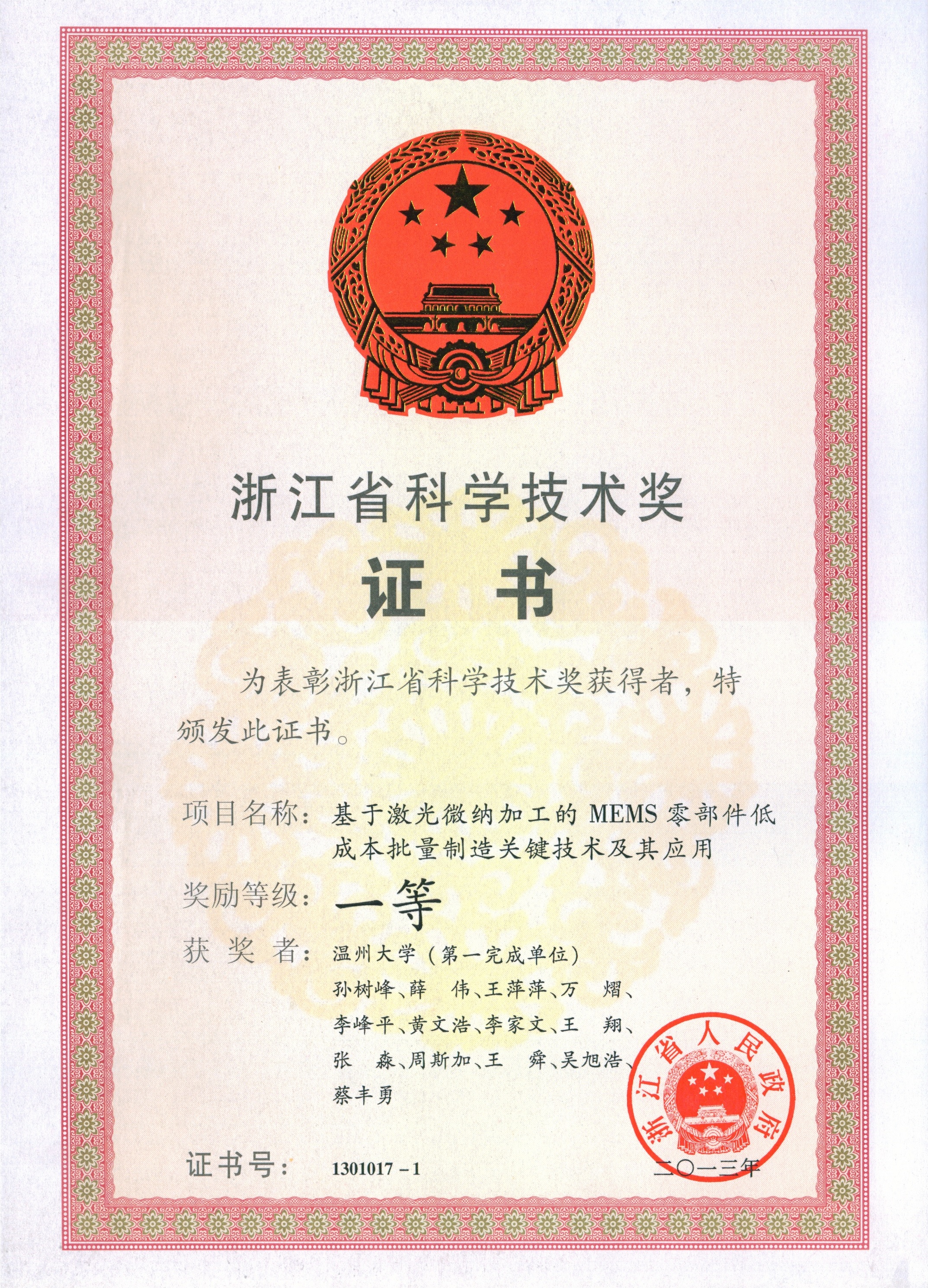 我院孙树峰副教授及其科研团队完成的《基于激光微纳加工的MEMS零部件低成本批量制造关键技术及其应用》成果获得2013年浙江省科学技术奖一等奖。此次省科学技术奖一等奖的获得填补了黑料网 建院历史以来省科学技术奖一等奖的空白,也是黑料网 建校历史上第二次获得省科学技术奖一等奖。对于提升我院学科科研水平,提高我院的学科科研影响力和办学声誉具有巨大的影响。